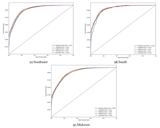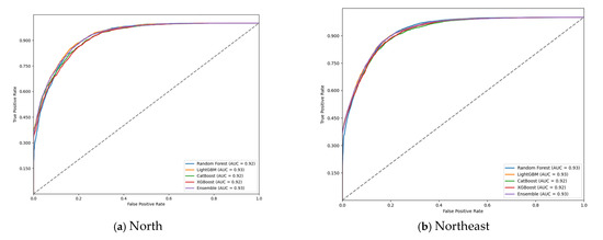The performance of four machine learning models—Random Forest, LightGBM, CatBoost, XGBoost, and an ensemble model—was evaluated across Brazil’s five regions (north, northeast, southeast, south, and midwest). All models demonstrated strong predictive capabilities, with accuracy ranging from 0.80 to 0.86 and AUC-ROC values between 0.89 and 0.94 (Table 2). The ensemble model consistently outperformed individual models, achieving the highest AUC-ROC (0.94) and F1 score (0.87) in the south region, along with the highest Mathew’s correlation coefficient (MCC) of 0.73.