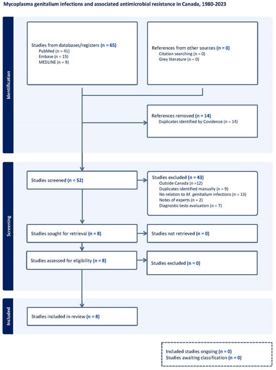 We used the following inclusion criteria: reports or articles documenting the incidence or prevalence of M. genitalium in the Canadian population or its provinces and territories. We also included peer-reviewed manuscripts that reported M. genitalium antibiotic resistance tested among patients or participants.