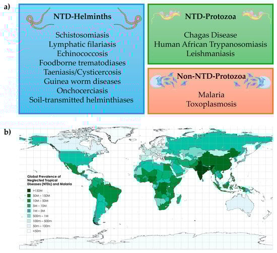 (a) Classification of certain parasitic diseases by etiological agent: helminthic vs. protozoan infections (and their NTD status). (b) Global prevalence of NTDs and malaria, collectively affecting over 1.1 billion people worldwide in 2021 [10].