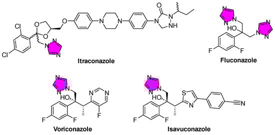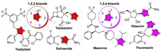 Representative drug molecules incorporating 1,2,3-triazole (in red) and 1,2,4-triazole (in magenta) heterocycles.