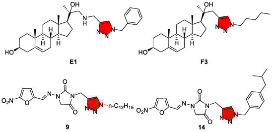 HAT, or sleeping sickness, is caused by Trypanosoma brucei (sub-species T.b. gambiense in West/Central Africa and T.b. rhodesiense in East Africa). Historically, treatment involved extremely toxic organic arsenicals. In recent years, enormous progress has been made with new drugs, notably fexinidazole, a nitroimidazole approved in 2018 as the first all-oral treatment for HAT, and the combination therapy of eflornithine/nifurtimox [104]. Triazole compounds have not played a major role in HAT therapy to date. One reason is that T. brucei (unlike T. cruzi) has some differences in sterol metabolism and drug uptake that make the antifungal azoles less effective. In bloodstream-form T. brucei, de novo ergosterol synthesis is largely shut down, and the parasites instead scavenge host cholesterol via receptor-mediated lipoprotein uptake (an ergosterol auxotrophy that bypasses the CYP51 target of azoles) [105]. Moreover, these forms are cloaked in a dense variant surface glycoprotein coat and lack specific uptake pathways for hydrophobic azole compounds, resulting in poor drug penetration and the low intracellular accumulation of azoles [106,107]. Early studies have found that ketoconazole and fluconazole exhibit only weak activity on T. brucei in vitro. Additionally, HAT parasites reside in blood and the central nervous system (CNS), where drug penetration and rapid cidal activity are critical [108]; the slow-acting static effect of azoles may be insufficient. However, medicinal chemists have explored diverse triazole derivatives against T. brucei in vitro, and some have shown low- and sub-micromolar potency. For example, certain nitrofurantoin triazoles (Figure 6, compounds 9 and 14) and amino steryl triazole compounds (Figure 6, E1 and F3) were reported to exhibit potent in vitro activity against T. brucei [70,109]. None have yet progressed to clinical trials.