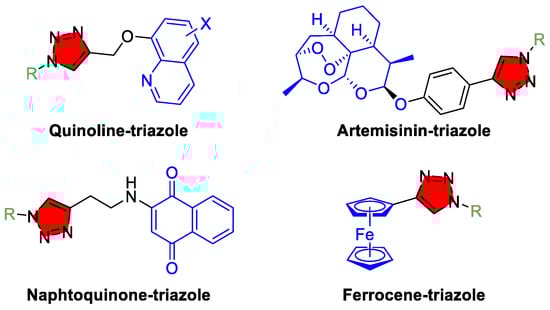 Medicinal chemists recognize 1,2,4-triazole and 1,2,3-triazole rings as “privileged” substructures that impart favorable properties. Recent reviews of 1,2,3-triazole-derived antimalarial scaffolds have highlighted many potent experimental compounds [47]. One strategy involves synthesizing hybrids of triazoles with established antimalarial pharmacophores (Figure 7). For example, triazole–quinoline hybrids have been developed to overcome chloroquine resistance, while others combine triazoles with artemisinin or naphthoquinones to target multiple parasite pathways [115,116,117]. Some of these hybrids exhibit low-nanomolar activity against P. falciparum in vitro (even against multidrug-resistant strains), and in vivo studies in mice have demonstrated parasite clearance and improved survival [48]. Another approach uses 1,2,3-triazoles as rigid linkers to construct dimeric or bis-quinoline molecules [118,119]. By tuning the length and substituents on the triazole connector, researchers have achieved enhanced potency and parasite selectivity. In one study, ferrocene–triazole–chloroquine hybrids (where the triazole tethered a redox-active ferrocene unit to a chloroquine-like moiety) showed activity below 100 nM against resistant P. falciparum [120,121]. Although these compounds remain preclinical, they represent next-generation antimalarial concepts. Given the emergence of resistance even to artemisinin-based combination therapies (ACTs) in some regions, new drug classes are urgently needed [122,123]. Triazole-containing molecules offer a rich area for diversification; their chemistry is amenable to modification, and the triazole ring can mimic or enhance binding interactions across a range of enzyme targets. Some analogs are being tailored to inhibit specific parasite enzymes, such as Plasmodium proteases or kinases [124,125].