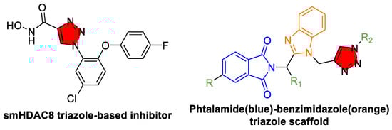 - Kalinin, D.V.; Jana, S.K.; Pfafenrot, M.; Chakrabarti, A.; Melesina, J.; Shaik, T.B.; Lancelot, J.; Pierce, R.J.; Sippl, W.; Romier, C.; et al. Structure-Based Design, Synthesis, and Biological Evaluation of Triazole-Based smHDAC8 Inhibitors. ChemMedChem 2020, 15, 571–584. [Google Scholar] [CrossRef] [PubMed]