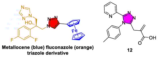 A breakthrough approach has been the application of bioorganometallic chemistry to triazole antifungals. Recently, it has been demonstrated that attaching an organometallic fragment, such as metallocene (Figure 10), to a fluconazole scaffold creates compounds with entirely new activity profiles against helminths [152]. These organometallic triazole derivatives were highly effective in vivo against parasitic worms such as Brugia (the causative agent of lymphatic filariasis) and Trichuris (a major cause of intestinal helminthiasis), achieving cures in infected animal models. Importantly, the modified triazoles do not rely on the inhibition of sterol synthesis (inactive in helminths) but instead target pathways that are absent in humans yet essential for worm survival. This innovative strategy reveals that the triazole core can be repurposed beyond its traditional antifungal role when paired with suitable chemical modifications.