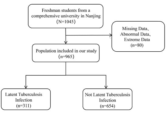 Aggregately, 1045 freshmen who were derived from tuberculosis key areas were enrolled in our study. These participants accomplished questionnaire surveys, tuberculin skin tests, and biochemical index examinations. After excluding missing data, abnormal data, and extreme data, 965 individuals were ultimately included in the analysis. According to the tuberculin skin test, 311 participants (32.23%) were identified as having tuberculosis latent infections, while another 654 (67.77%) were classified as not having tuberculosis latent infections (Figure 1).