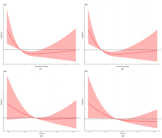 Restricted cubic spline (RCS) of eosinophils percentage and uric acid. Abbreviations: (1) restricted cubic spline of eosinophils percentage; (2) restricted cubic spline of eosinophils percentage by gender stratification; (3) restricted cubic spline of uric acid; (4) restricted cubic spline of uric acid by gender stratification.