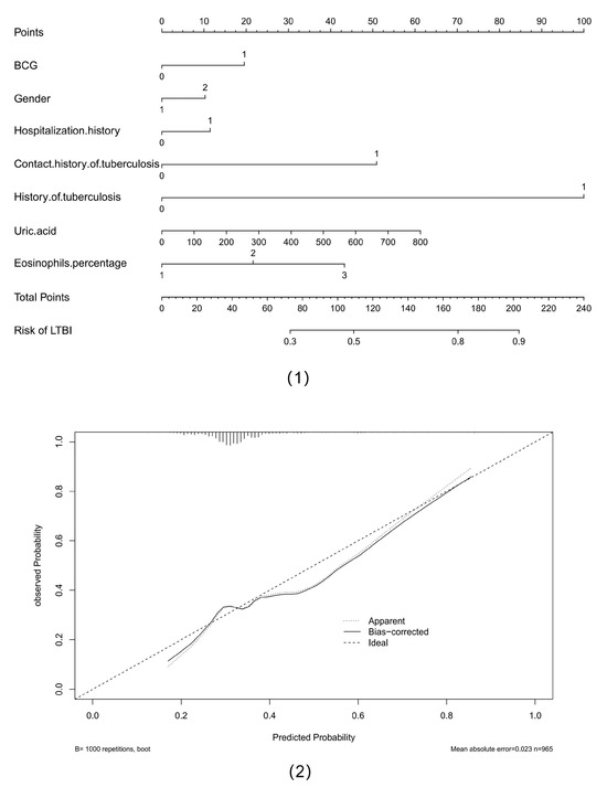 Nomogram of predicting the risk of latent infection of tuberculosis and calibration curve of multiple models. Abbreviations: (1) nomogram of predicting the risk of latent infection of tuberculosis; (2) calibration curve of multiple models.