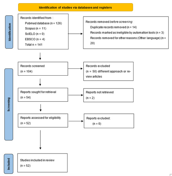 After the selection process, 52 articles were chosen to analyze the strategies of environmental disinfection and decolonization of C. auris. Of these, 40 corresponded exclusively to strategies for disinfecting environments contaminated by C. auris, 11 to decolonization strategies, and one addressed both strategies.
