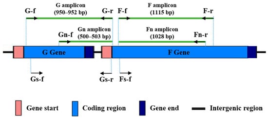 HRSV is a single-stranded negative-sense RNA virus that belongs to the Pneumoviridae family and genus Orthopneumovirus [4]. Its genome is approximately 15.2 Kb in length and is organized into 10 genes that encode 11 viral proteins, consisting of 2 non-structural and 9 structural proteins. The molecular epidemiology of HRSV is quite complex due to its rapid genetic changes, leading to the emergence of numerous genotypes grouped into two main antigenic groups: subgroups A (HRSV-A) and B (HRSV-B), which circulate in different seasons and geographical regions [5,6]. The sequence of the G gene or its second hypervariable region has been used in numerous epidemiological and evolutionary studies [1,3]. However, some authors highlight that analyzing this region may not always be the best approach, since in some cases it might not distinguish whether two isolates belong to the same lineage or not [1]. Unlike the G protein, the sequences of the F ectodomains differ only by ~5% between HRSV-A and HRSV-B, rendering this an interesting target region for the development of prophylactic tools against HRSV such as the monoclonal antibodies Palivizumab and Nirsevimab [2,3]. Considerable effort has been made to classify HRSV genotypes below the subgroup level [1,7,8,9,10,11]. However, some of the traditional amplification strategies may have shown some challenges due to different amplification efficiencies for one subgroup over another due to sequence variability and dissimilar melting temperatures (Tm) of amplification primers, which can compromise both specificity and yield [12,13,14,15]. Very recently, the HRSV Genotyping Consensus Consortium (RGCC) proposed a new standardized system for the phylogenetic classification of the different HRSV genotypes, applicable to both complete and partial genomes [16]. This classification is important not only for taxonomic purposes but also to better understand the epidemiology and therefore the implementation of therapeutic and preventive strategies for this virus [1].