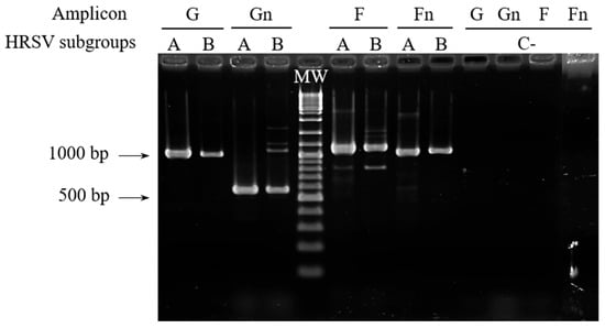 RT-PCR assays for G, Gn, F, and Fn amplicons with samples representing the two HRSV subgroups, analyzed by agarose gel electrophoresis. Results shown for G and F amplicons were obtained with 35 amplification cycles, using sample 110 for HRSV-A and sample 30 for HRSV-B as example. The arrows indicate the size in base pairs of two bands of the molecular weight (MW) marker. C−: negative controls.