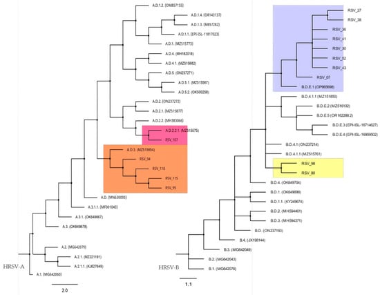 - Salimi, V.; Viegas, M.; Trento, A.; Agoti, C.N.; Anderson, L.J.; Avadhanula, V.; Bahl, J.; Bont, L.; Brister, J.R.; Cane, P.A.; et al. Proposal for Human Respiratory Syncytial Virus Nomenclature below the Species Level. Emerg. Infect. Dis. 2021, 27, 1–9. [Google Scholar] [CrossRef]