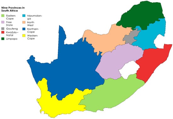 This study analyzed nationwide survey datasets—five cycles of the SABSSM survey. The surveys were conducted across the nine provinces of South Africa, including the Western Cape, Eastern Cape, Northern Cape, Free State, KwaZulu-Natal, North West, Gauteng, Mpumalanga, and Limpopo (see Figure 1 for geographical location). South Africa, a country with a population of over 63 million, has about 8 million people living with HIV [1,34]. This is the highest number of HIV cases globally.