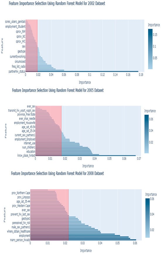 To select the important predictors (features), we first applied one-hot encoding to encode the selected variables. Since all the variables were categorical, this procedure transformed each category into binary variables, represented by 0 and 1. The encoding ensures the applicability of ML algorithms to the variables [37]. Thereafter, a correlation analysis assessed multicollinearity between the explanatory variables before the feature selection. A correlation coefficient threshold of >0.8 indicated multicollinearity, and a few were detected in the 2002 and 2008 datasets (Figure S1). The feature selection process consisted of two phases. In the first phase, we conducted a Chi-square test to identify significant explanatory variables (predictors) associated with HIV testing. This test served as a prescreening tool for a large number of explanatory variables in the SABSSM datasets. Variables with a p-value of less than 0.05 were retained as inputs for the ML algorithms, which were then used to train and validate the models. The selected variables in the initial feature selection are presented in Table S1. In the second phase, the best model—random forest—was employed to further refine the feature set. By analyzing feature importance scores, the random forest identified the 20 most essential predictors from each dataset. These features are illustrated in Figure 2. This two-phase approach guaranteed that only the most relevant variables were incorporated into the final models.
