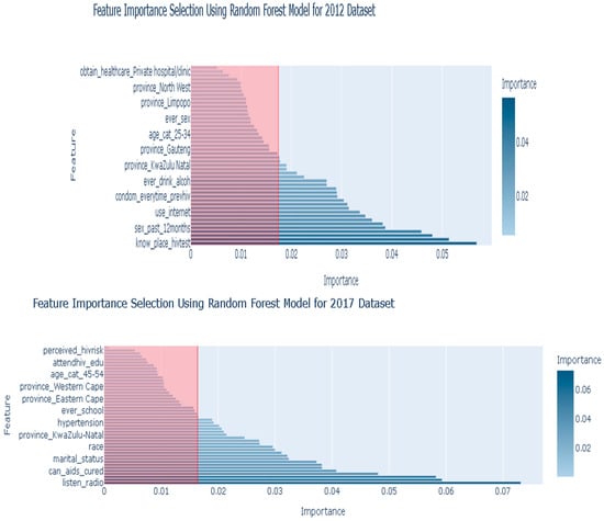 Feature importance selection using the random forest model. Note: The minimum threshold for feature importance was set at 50th percentile; red area shows variables below the threshold.