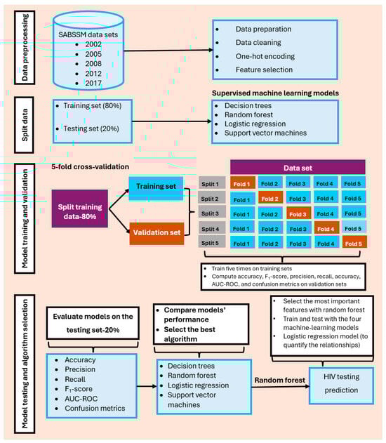 All analyses in the study were performed with Python version 3.12.0, developed by the Python Software Foundation, Wilmington, DE, USA. Figure 3 shows data preprocessing, feature selection, model training, and validation, as well as HIV testing prediction modeling using the five SABSSM datasets.