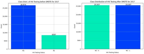 Figure 4 shows the class distribution of HIV testing before and after applying SMOTE on the 2017 SABSSM datasets. The distributions for 2002, 2005, 2008, and 2012 can be found in Figure S3.
