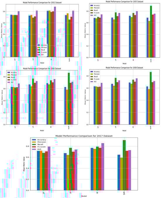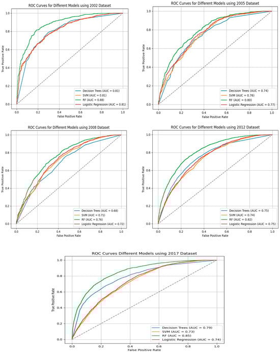 The random forest model demonstrated the highest overall performance in the preliminary analysis, particularly on the 2002 datasets, with an accuracy of 83.80%, precision of 83.28%, recall of 83.75%, and F1-score of 83.51% (Table S2; Figure S2). The AUC of 91.55% is the highest across all datasets, demonstrating excellent ability to discriminate between the classes. Additionally, the cross-validation average for the random forest on the 2002 dataset is 83.01%, reflecting consistent and reliable model performance across folds. The random forest also recorded the highest accuracy in classification, with the highest number of true positives and true negatives compared to the other ML models (Figure S2). This model demonstrates the best combination of predictive power and consistency across all the datasets. However, SVM outperformed all other models in the 2002 dataset in terms of precision (90.13%), while logistic regression achieved the highest recall (84.2%) in the 2012 dataset. Overall, random forest emerged as the best model in predicting HIV testing in the preliminary analysis of the five SABSSM survey datasets. The SVM and logistic regression performed reasonably well compared to the decision tree.
