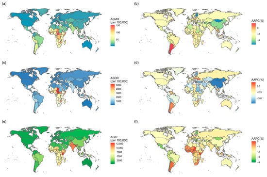 In 2021, LRIs caused approximately 2.2 (95% uncertainty interval (UI): 2.0 to 2.4) million deaths worldwide, with a global ASMR of 28.7 (95% UI: 26.0 to 31.1) per 100,000. The AAPC was −2.4% (95% CI: −2.6 to −2.3%; p < 0.05) from 1980 to 2021. Regionally, Central sub-Saharan Africa recorded the greatest ASMR, at 106.7 (95% UI: 81.8 to 138.6) per 100,000 in 2021 (Supplementary Table S1). The country with the highest ASMR in 2021 was the Central African Republic, followed by Eritrea and Chad (Figure 1a). Between 1980 and 2021, ASMR showed a decline in most countries, with the largest reductions observed in Finland, Mongolia, and Kyrgyzstan. Only a few countries, such as Argentina, exhibited an increasing trend (Figure 1b).