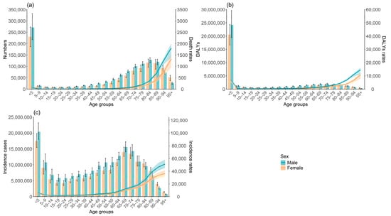 Global burden of lower respiratory infections by age and sex in 2021. (a) Deaths; (b) DALYs; (c) incidence. DALYs, disability-adjusted life years.