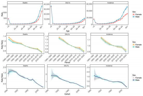 Globally, the age effect analysis showed that the risk of DALYs for LRIs initially decreased and then increased with age, with the highest risk observed in the <5 years age group. Both the period and cohort effects exhibited a downward trend in both males and females (Figure 3).