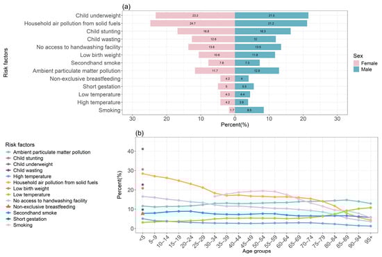 Percentage of DALYs due to lower respiratory infections attributable to risk factors by sex and age globally in 2021. (a) Sex; (b) age. DALYs, disability-adjusted life years.