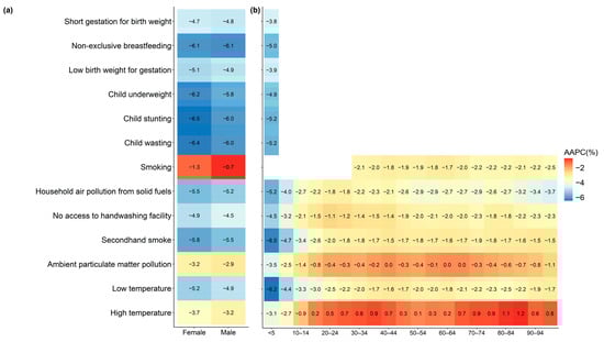 AAPC of lower respiratory infections DALYs attributable to risk factors by sex and age globally from 1990 to 2021. (a) Sex; (b) age. AAPC, average annual percentage change; DALYs, disability-adjusted life years.