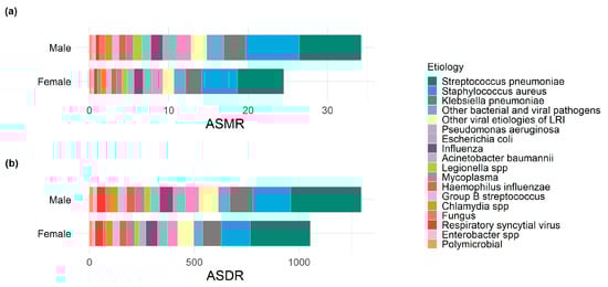 Etiology distribution of global lower respiratory infections ASMR and ASDR by sex in 2021. (a) ASMR; (b) ASDR. ASMR, age-standardized mortality rate; ASDR, age-standardized disability-adjusted life years rate.