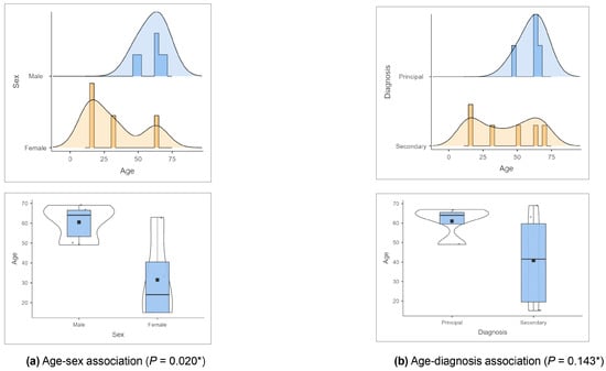 Age distribution and relationship with other variables: (a) age–sex association, (b) age–diagnosis association. (* ANOVA).