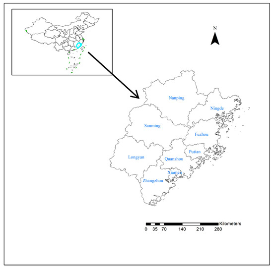 Fujian Province is located along the southeastern coast of China, spanning 23°31′–28°18′ N latitude and 115°50′–120°43′ E longitude. Fujian administers 9 prefecture-level cities and the Pingtan Comprehensive Experimental Zone. It covers a land area of 124,000 km2 and a maritime area of 136,000 km2, with a population of approximately 41.83 million. Fujian’s terrain is predominantly composed of mountains and hills, with two major mountain ranges in the western and central areas forming the topographical backbone of the province. Numerous branches extend outward in all directions, creating a crisscrossing pattern of peaks and ridges. Hills are widely distributed along the outer mountain areas and coastal zones. Fujian has a typical subtropical climate, characterized by mild winters, relatively moderate summers, and abundant rainfall, which are conducive to the transmission of HFMD virus (Figure 1).