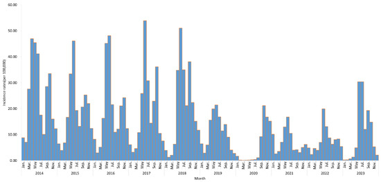 From 1 January 2014 to 31 December 2023, a total of 672,358 HFMD cases were reported in Fujian Province, including 1092 severe cases and 23 deaths. The average incidence rate was 169.58 per 100,000 and the mortality rate was 0.01 per 100,000. The case fatality rate was 3.45 per 100,000. From 2014 to 2018, the incidence of HFMD remained relatively stable. The incidence began to decline from 2019, with a greater decrease observed between 2020 and 2022. However, in 2023, there was a slight rebound in incidence. Overall, HFMD in Fujian Province showed a distinct seasonality, with two annual peaks. The primary peak occurred between May and June, and the secondary peak appears in September to November (Figure 2).