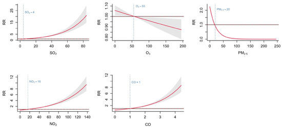 The model fitting results showed that the GAM explained 9.35% of the deviance in HFMD incidence, with an adjusted R-squared of 6.39% and a GCV score of 0.415. Although the indexes did not reach ideal levels, it still indicates the independent association between air pollutants and HFMD incidence, given the multifactorial nature of HFMD transmission. Key findings of GAM revealed that the cumulative exposure–response curves for SO2, NO2, and CO exhibited a monotonically increasing pattern. At concentrations below the median levels (SO2 ≈ 4 μg/m3, NO2 ≈ 16 μg/m3, CO ≈ 1 mg/m3), the cumulative RR were less than 1, suggesting lower transmission risk at low pollution levels. RR increased progressively with rising pollutant concentrations. The curves for O3 and PM2.5 showed a decreasing trend. At sub-median concentrations (O3 ≈ 55 μg/m3, PM2.5 ≈ 20 μg/m3), the cumulative RRs were greater than 1, implying higher transmission risks in low-to-moderate concentrations. As O3 and PM2.5 concentrations increased, the RR declined to less than 1 (Figure 5).