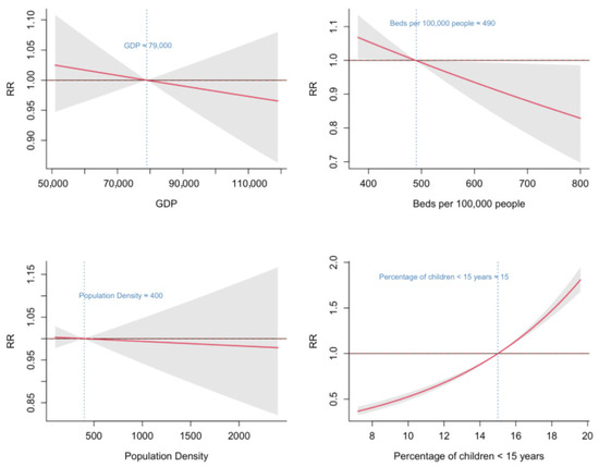 Regarding socioeconomic factors, the proportion of children < 15 years and the number of hospital beds per 100,000 population were significantly associated with HFMD incidence. The number of hospital beds per 100,000 population showed a monotonically decreasing relationship with HFMD risk, indicating that the RR of HFMD declined as the number of hospital beds per 100,000 population increased. When the number of beds exceeded 490 per 100,000 population, the RR was less than 1. The proportion of children < 15 years exhibited a monotonically increasing association, with RR exceeding 1 when the proportion surpassed 15%. No significant associations were observed between HFMD incidence and either per capita GDP or population density (Figure 6).