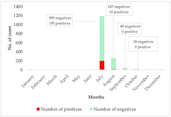 In 2024, reports of unusual cases of malaria-like illness in several districts of the Eastern Region of Ghana that were not responding to standard anti-malarial treatment regimens were detected. These cases were therefore managed as acute febrile illness. Patient samples were sent to the Noguchi Memorial Institute for Medical Research (NMIMR) for further testing. The criteria for suspected Dengue fever cases included acute onset of high fever (≥38 °C) lasting 2–7 days, accompanied by two or more of the following: diarrhea, fatigue, nausea/vomiting, loss of appetite, muscle and joint pains, rash, and haemorrhagic manifestations. The samples were screened for Dengue fever, Chikungunya, and Zika viruses using the CDC Trio plex assay—a real-time quantitative polymerase chain reaction (RT-PCR). Testing confirmed Dengue fever cases. All confirmed cases were classified as non-severe and managed at home. The Ghana Health Service (GHS) declared a Dengue fever outbreak on 14 July 2024. Following the outbreak, 1410 suspected blood samples were tested by NMIMR, of which 205 tested positive for the Dengue fever virus. The confirmed cases were distributed across eight administrative regions of Ghana, with the Eastern Region emerging as the hotspot of the outbreak. The peak of the outbreak was in July (Figure 1). The initial diagnosis of febrile illnesses as malaria is a systemic issue in low- and middle-income countries in the tropics, which are endemic malaria regions, and this impacts the true rate of clinical malaria [19].