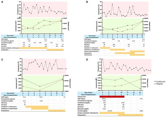 Serial clinical and laboratory data of the patients. (A) Case 1; (B) Case 2; (C) Case 3; (D) Case 4. Daily trends in body temperature, leukocyte count, platelet count, CRP, procalcitonin, creatinine, AST, and ALT are shown. Empirical antibiotic regimens and timing of clinical response to doxycycline were also indicated, illustrating disease progression and therapeutic outcomes. Red highlight: supportive therapy; orange highlight: antibiotic therapy.