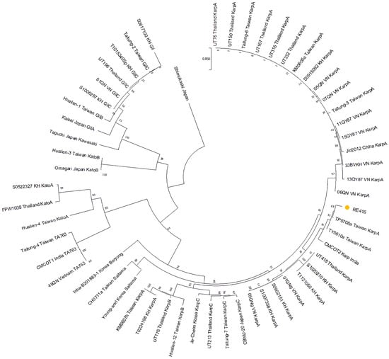 - Izzard, L.; Fuller, A.; Blacksell, S.D.; Paris, D.H.; Richards, A.L.; Aukkanit, N.; Stenos, J.; Nguyen, C.; Jiang, J.; Fenwick, S.; et al. Isolation of a novel Orientia species (O. chuto sp. nov.) from a patient infected in Dubai. J. Clin. Microbiol. 2010, 48, 4404–4409. [Google Scholar] [CrossRef]