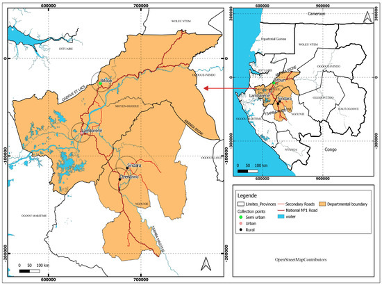 The study was carried out in Lambaréné at the Centre de Recherches Médicales de Lambaréné. The study site included Lambaréné city (a semi-urban area), rural areas surrounding Lambaréné (villages located north and south of Lambaréné in the Ogooué et Lacs department, in the Gabon country), and remote areas of Tsamba-Magotsi in the Ngounié province of Gabon. These areas are known to be endemic for parasitic infections such as malaria, STH, and schistosomiasis. Lambaréné city is located 60 km south of the equator and is surrounded by several villages along the N1 national road, both to the north and south of the city. Lambaréné has approximately 45,000 inhabitants, while the surrounding rural areas have about 3500 inhabitants, according to a national survey in 2016 [17]. In Tsamba-Magotsi (with 14,875 inhabitants), the study was conducted in rural areas along the N1 national road, from the Tchad villages to Oyenano village, including Koinia village located on the Sinadara road, which constitutes remote rural areas relative to Lambaréné. These areas are close to Fougamou City, the second-largest town of the Ngounié province (Figure 1). Previous research has documented the presence of infectious diseases such as urinary schistosomiasis and soil-transmitted helminth (STH) infections in these areas [17].