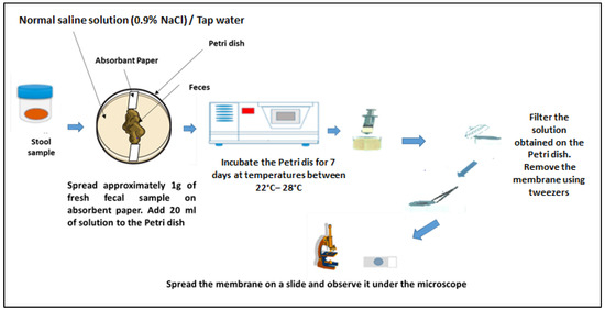 To detect hookworms and Strongyloides stercoralis larvae in stool samples, the coproculture technique was applied. Approximately 1 g of the stool sample was spread on a slide and covered with filter paper. This device was placed in a Petri dish, and approximately 20 mL of Normal saline solution: 0.9% NaCl (or sterile tap water) was added to the bottom of the dish. The preparation was then incubated for 7 days at a temperature of 22–28 °C. After incubation, approximately 10 mL of water was collected with a syringe and filtered using a Whatman nucleopore membrane (12 µm pore size) and a Swinnex (Merck, Darmstadt, Germany) filter holder. The filter paper was then examined under a microscope with a drop of 2% Lugol’s iodine solution. The sample was considered positive if at least one larva was detected (Figure 2) [20].