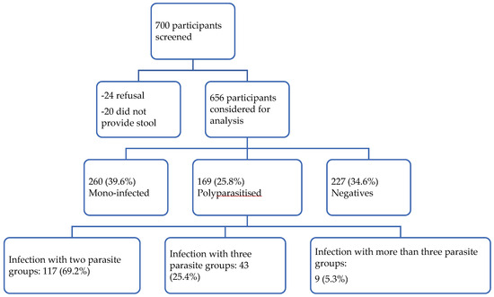 All data were recorded in the Red Cap database, exported in Excel (2016 version), and analysed using StataIC 16. Percentages and frequencies were used to express categorical variables with a confidence interval (CI). The normality of continuous variables was assessed using the Kolmogorov–Smirnov and the Shapiro–Wilk tests. The median and interquartile range (IQR) were used for continuous variables. The logistic regression was used to identify associated factors with polyparasitic infection. Additionally, a linear regression was performed to examine the effect of multiple variables on haemoglobin levels. Confidence intervals were set at 95% ([95% CI]), and p-values were considered significant at values less than or equal to 0.05 (5%).