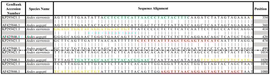 Multiple sequence alignment for Ae. aegypti and Ae. sierrensis. Forward primers are colored in green, probes in yellow, and reverse primers in red.