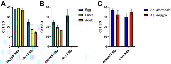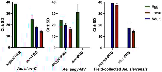 Mean Ct values ± standard deviation obtained from the AegySierr.ID-qPCR assay using species-specific probes (aegypti-PRB and sierr-PRB) for Aedes sierrensis (A) and Ae. aegypti (B) across three sample types that were previously identified with specific species using microscopy and binomial keys: egg, larva, and adult. Mean Ct values ± standard deviation for eDNA (C) for both species with Ae. sierrensis-designated samples and Ae.aegypti-designated samples.