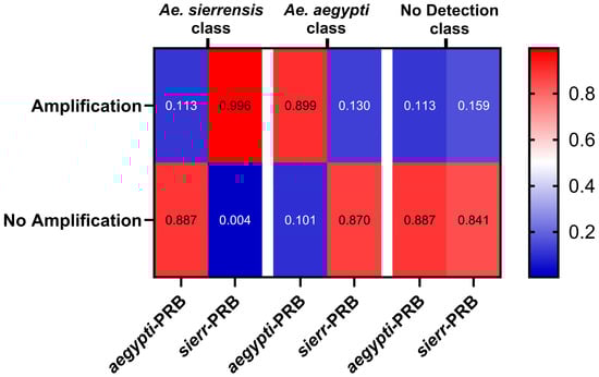 The latent classes were interpreted based on the response probabilities associated with each probe. One class showed a high probability of amplification for the sierr-PRB probe and a low probability with aegypti-PRB, indicating the presence of Ae. sierrensis in the sample. A second class showed the opposite pattern with a high amplification probability with aegypti-PRB and low with sierr-PRB. The third class showed low amplification for both probes, consistent with no detection of either species. These classes were interpreted as Ae. sierrensis, Ae. aegypti, and No Detection (Figure 3). The LCA-derived class for each sample was then used as a proxy truth value to evaluate the accuracy of the AegySierr.ID-qPCR assay with eDNA.