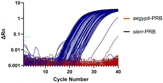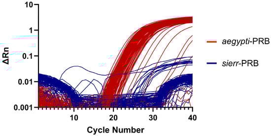 The rate of false-positive amplification was low, occurring in fewer than 1% of Ae. sierrensis egg samples and 10% of Ae. aegypti egg samples, as indicated by the presence of amplification curves (Figure 4 and Figure 5) and Ct values (Table 3). However, there was a single instance of a false positive in which a verified Ae. aegypti egg sample from Orange County amplified the sierr-PRB probe and produced a lower Ct than the aegypti-PRB probe. Although this may suggest a low assay specificity for this specimen, the amplification curve was irregular and displayed a sharp increase in fluorescence during the early amplification phase (cycle number 3–13), which declined shortly after (Figure S1). Atypical amplification curves such as this may occur if the DNA template concentrations are too high [53]. In all other cases, when an incorrect probe was amplified, the Ct value that was produced from the amplification of the correct probe was lower, indicating the true positive.