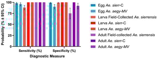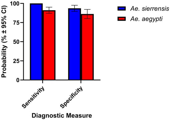 The sensitivity and specificity measures of the AegySierr.ID-qPCR assay were calculated using Excel (Microsoft Corporation, Redmond, WA, USA) for each sampling region, species, and location with the following equations [39]: