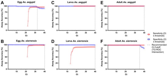 TG-ROC graphical analysis for determining Ct cutoffs for species classification using the AegySierr.ID-qPCR assay. Panels show assay performance by life stage: (A) Ae. aegypti egg tissue (n = 119); (B) Ae. sierrensis egg tissue (n = 114); (C) Ae. aegypti larva tissue (n = 31); (D) Ae. sierrensis larva tissue (n = 156); (E) Ae. aegypti adult tissue (n = 72); and (F) Ae. sierrensis adult tissue (n = 87). Sensitivity (red) and specificity (blue) curves are plotted against Ct values. Sensitivity (red) and specificity (blue) curves were plotted against Ct values. The dashed vertical line indicates the Ct cutoff, corresponding to the intersection of the two curves where applicable. When no clear intersection occurs or the curves remain overlapping, a default cutoff of Ct = 40 (the final qPCR cycle) was applied.