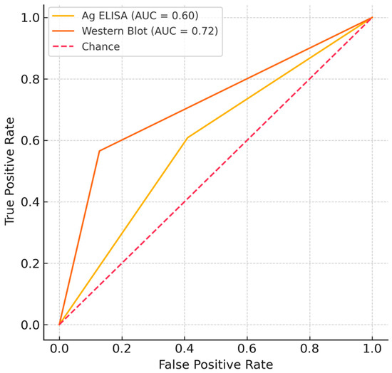 Receiver–operating–characteristic ROC curves for binary Ag ELISA and Western Blot. The diagonal dashed line represents a non-discriminatory test. AUC is Area Under the Curve.