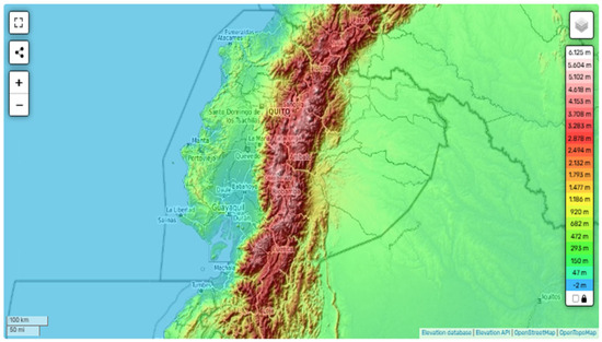 Topographic map of Ecuador showing the three continental regions—Coast (0–500 m, higher temperatures), Andes (500–6126 m; lower temperatures), and Amazonia (200–1000 m; higher temperatures)—highlighting elevation gradients and associated climatic zones. From: OpenStreetMap contributors. Topographic map of Ecuador [Internet]. OpenStreetMap; n.d. [accessed on 1 September 2025]. Available at: https://es-ec.topographic-map.com/map-m3ggp/Ecuador/?center=-1.41709%2C-78.32703&zoom=7&base=2 [16].