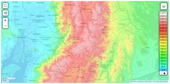 Topographic map of the central Andean region of Ecuador, including the province of Chimborazo. The map displays elevation gradients ranging from 2376 m to 5041 m.a.s.l., using a color scale from green (lower elevations, higher temperatures) to red (higher elevations, lower temperatures). The region is characterized by an equatorial high-mountain climate, with average temperatures around 8 °C and frequent drops below 0 °C at higher altitudes. These environmental conditions, namely low temperature, reduced humidity, and high elevation, are generally unsuitable for the survival of Lutzomyia sandflies and the transmission of Leishmania parasites. Despite this, confirmed cases of leishmaniasis have been reported in several cantons, suggesting a possible shift in ecological suitability due to climate change. From: OpenStreetMap contributors. Topographic map of the Province of Chimborazo [Internet]. OpenStreetMap; n.d. [accessed on 1 September 2025]. Available at: https://es-ec.topographic-map.com/map-xg457/Cuenca/?center=-2.27513%2C-78.68716&zoom=9 [16].