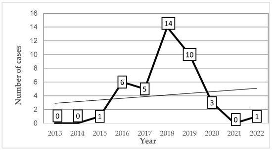 Annual distribution of leishmaniasis cases in the cantons Alausi and Chunchi, 2013–2022. The figure displays the number of reported leishmaniasis cases per year in the canton of Alausi that includes the city of Alausi and the parish of Huigra, the two cities where the cases were reported. A notable increase occurred between 2016 and 2019, peaking in 2018 with 14 cases. The trend declined thereafter, with only one case reported in 2022. No cases were recorded in 2013, 2014, and 2021.
