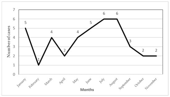 The monthly trend of leishmaniasis cases revealed two peaks: a significant peak in July and August, with six cases each, and a smaller peak in January, with five cases. Leishmaniasis cases gradually increased from two in April to six in August—months characterized by the so-called summer, a less rainy season—followed by a notable decrease from September to November (three to two cases) and no reports in December, the rainier and colder months of the year. Statistical analysis indicated significant differences in the monthly reports of leishmaniasis cases (p = 0.001). Overall, the trend in leishmaniasis cases in Chimborazo showed a fluctuating pattern, with a notable decrease towards the end of the study period. No fatalities were reported during this time. Figure 4 provides a visual representation of this data.