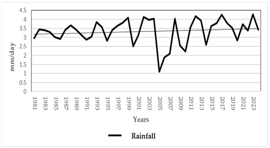 Rainfall trend in the Alausí Area, Ecuador (1981–2024). The graph displays fluctuations in precipitation (mm/day), with notable variability across the years. The years 2018 and 2019 correspond to the highest prevalence rates of mucocutaneous leishmaniasis, coinciding with cases reported in the greatest number of months. In 2018, a reduction in minimum temperature and rainfall was associated with decreased disease prevalence, with the lowest reduction observed in September. These climatic patterns may have influenced vector ecology and transmission dynamics in the region. Font: NASA.org.